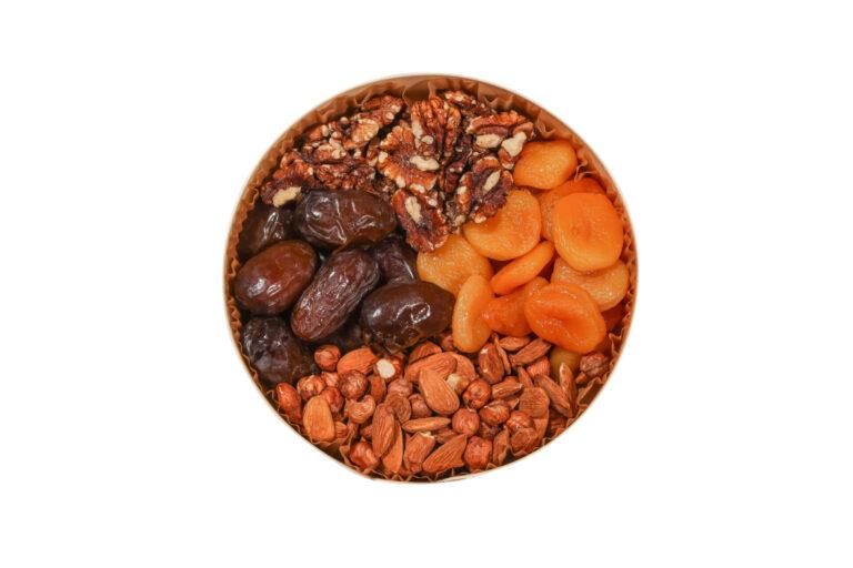 Plateau de fruits secs 4 variétés (suggestion : dattes, amandes, noisettes, abricots secs)
