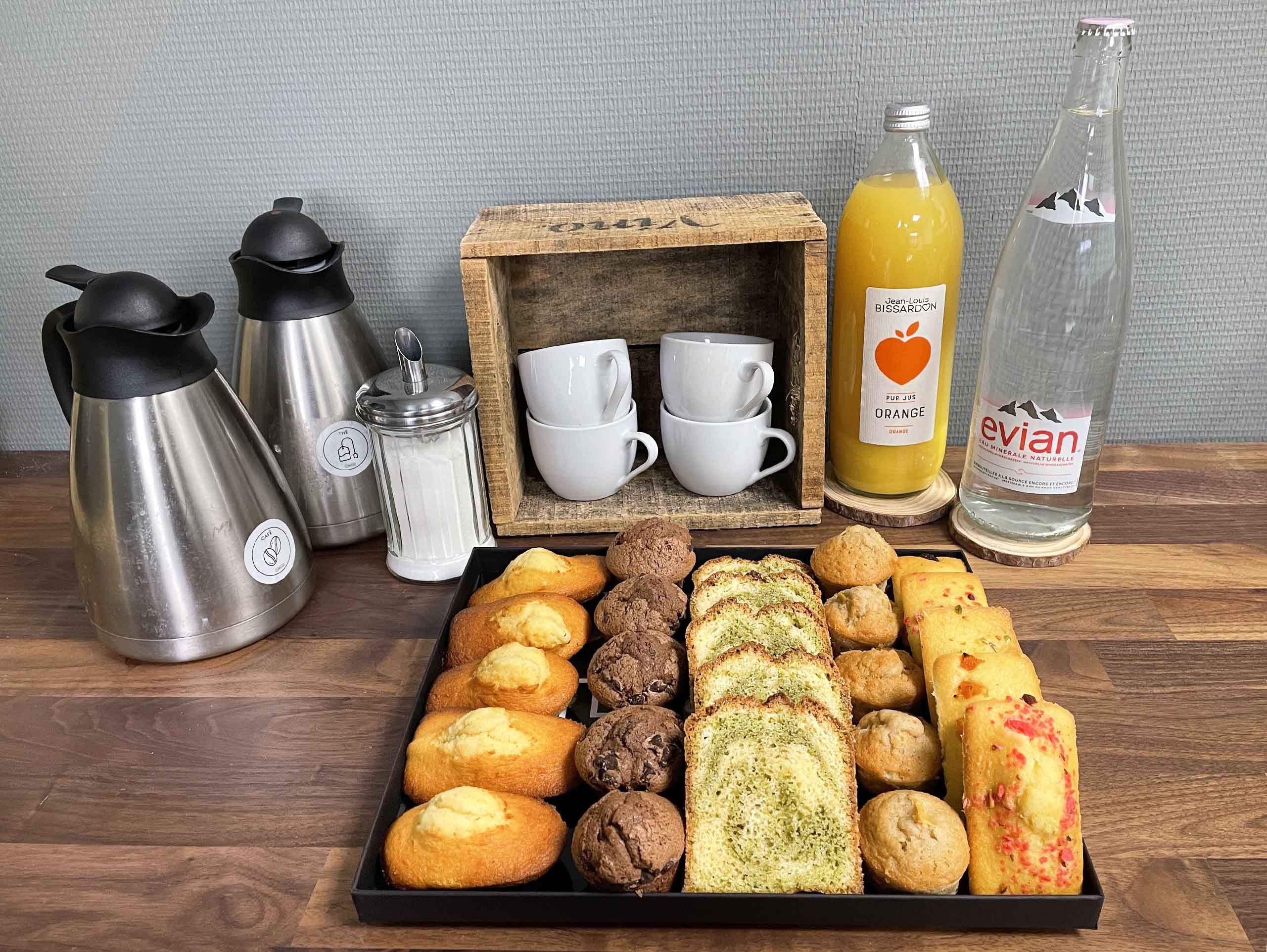Formule pour 6 à 8 convives Mini-viennoiseries – 25 pièces Pain au chocolat, croissant, chausson au pomme, torsade au chocolat, pain aux raisins Jus de fruits artisanal Bissardon – 1L (Orange ou assortiment de jus si plusieurs formules) Eau plate Evian – 1L Une boisson chaude par personne (servie en thermos) – (Café bio Mokxa ou Thé bio Palais des thé) Tasses, serviettes, gobelets, touillettes et sucre sont fournis. Commande possible jusqu’à la veille 18h, sous réserve de disponibilité.