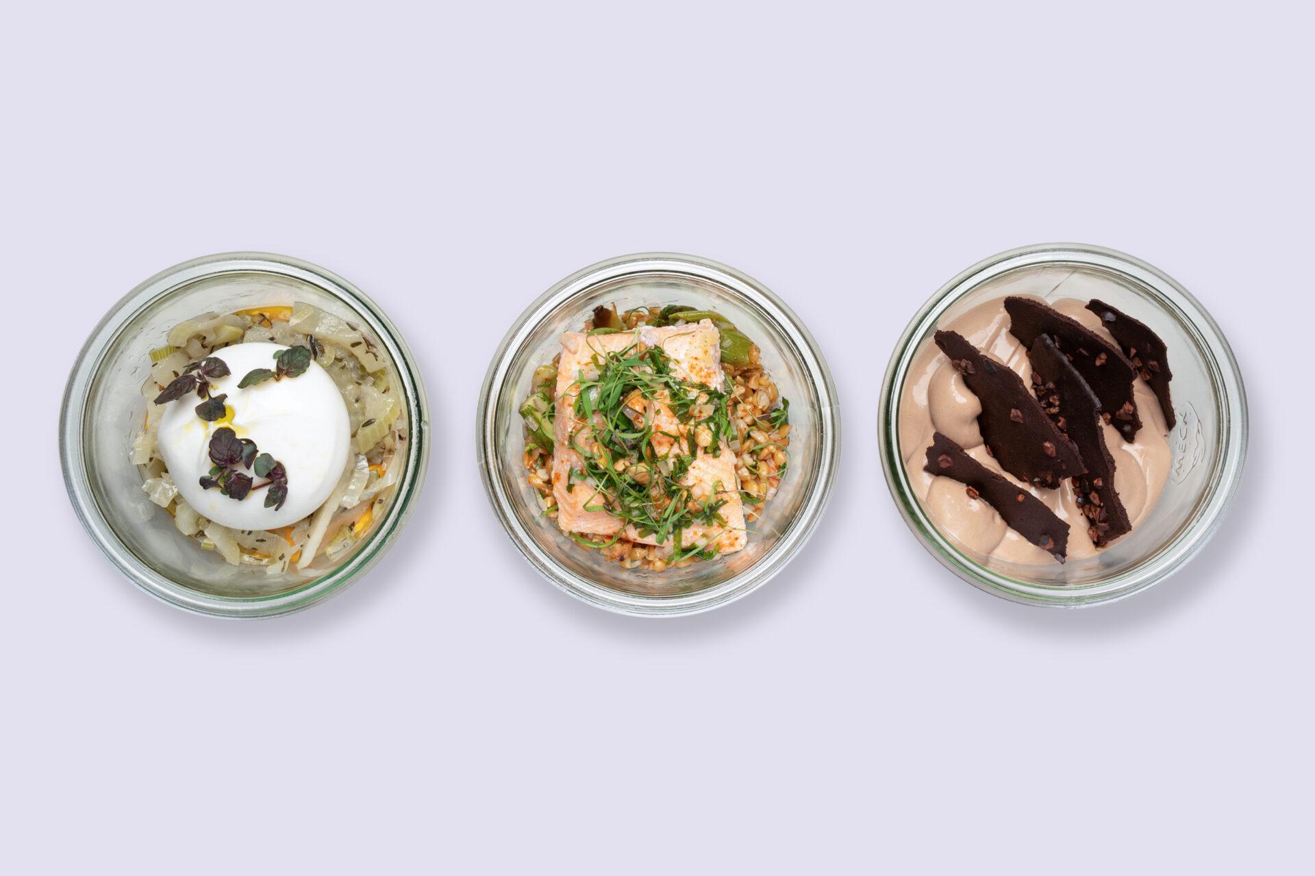 • Œuf mayonnaise au curry mango, pois gourmands et quinoa rouge. • Betteraves rôties, boulgour et labneh. • Cheesecake à la vanille, rhubarbe pochée à la fleur d’oranger. Inclus : kit couverts inox, miche de pain. Allergènes : Gluten, lactose, soja, œuf, moutarde, sulfites. Commande possible jusqu’à la veille 18h pour une livraison du lundi au vendredi et jusqu’au jeudi 18h pour une livraison le week-end. Sous réserve de disponibilité.
