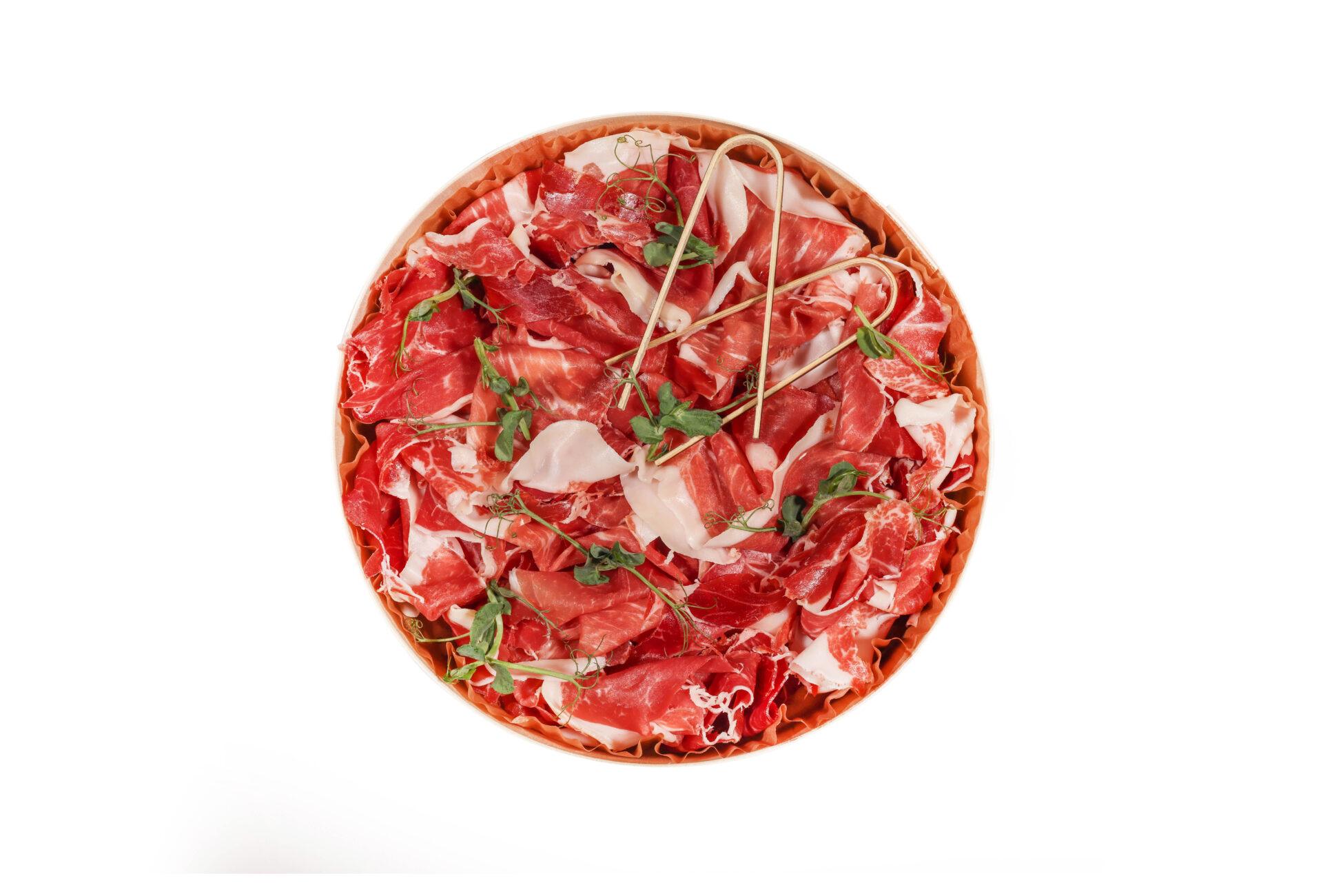Sélection de charcuterie fine italienne – 730g :  Speck Jambon cuit aux herbes Rosette Porchetta au four Informations complémentaires :  Commande au plus tard 48h à l’avance. Des frais de livraison sont à prévoir selon la zone (entre 16€HT et 42€HT). Pain non inclus.