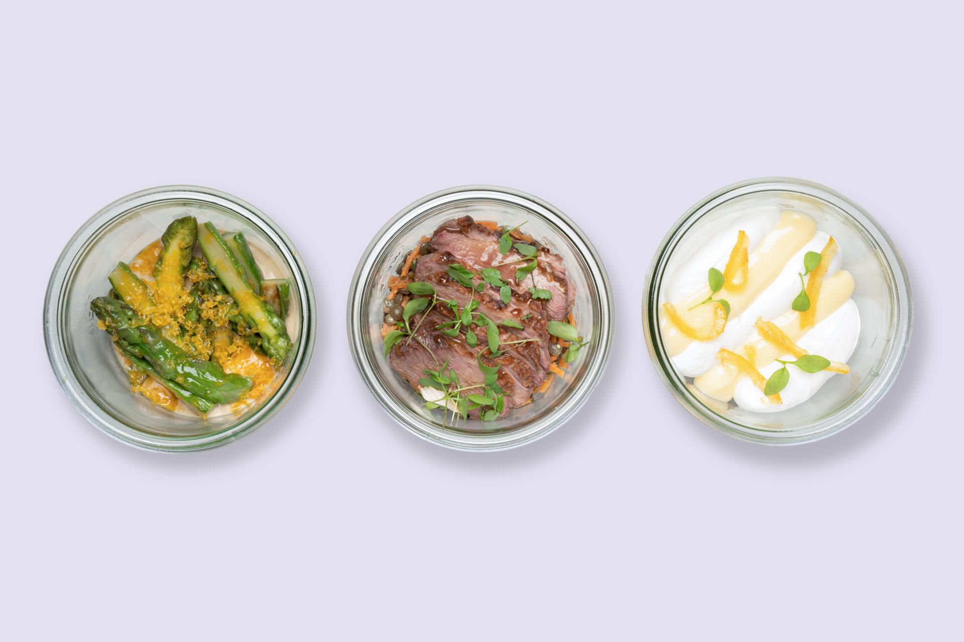 • Gnocchis poêlés à l’huile de sauge, tombée d’épinards et crème de cresson. • Cabillaud à la crème citronnée, asperges et fenouil rôtis, riz basmati. • Brioche perdue au sirop d’érable et compotée de myrtilles. Inclus : kit couverts inox, miche de pain. Allergènes : Gluten, lactose, œuf, sulfites, poisson. Commande possible jusqu’à la veille 18h pour une livraison du lundi au vendredi et jusqu’au jeudi 18h pour une livraison le week-end. Sous réserve de disponibilité.