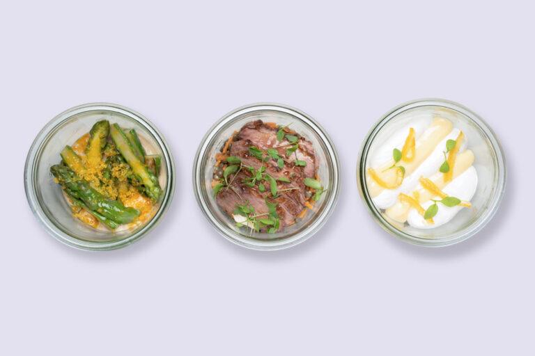 • Crémeux d’asperges blanches au café, jaune d’œuf confit, salade de pointes d’asperges. • Magret de canard rosé, lentilles vertes, carottes râpées, vinaigrette à la moutarde et au miel. • Madeleine au citron, crémeux citron et ganache au yaourt grec, écorces de yuzu confites. Inclus : kit couverts inox, miche de pain. Allergènes : Gluten, lactose, œuf, céleri, moutarde, sulfites. Commande possible jusqu’à la veille 18h pour une livraison du lundi au vendredi et jusqu’au jeudi 18h pour une livraison le week-end. Sous réserve de disponibilité.
